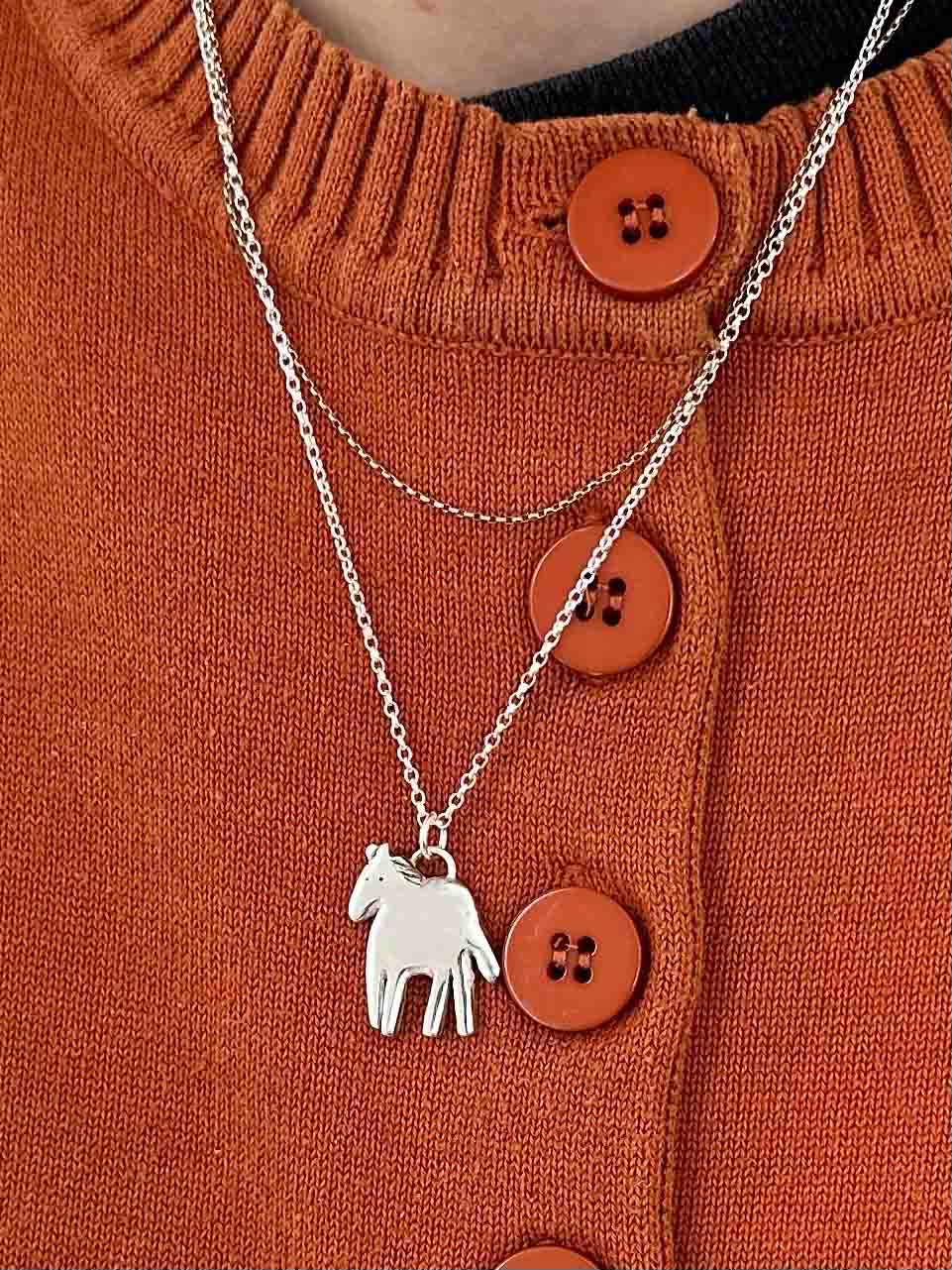 Model is wearing 20" Mayoneighs The Horse Necklace.