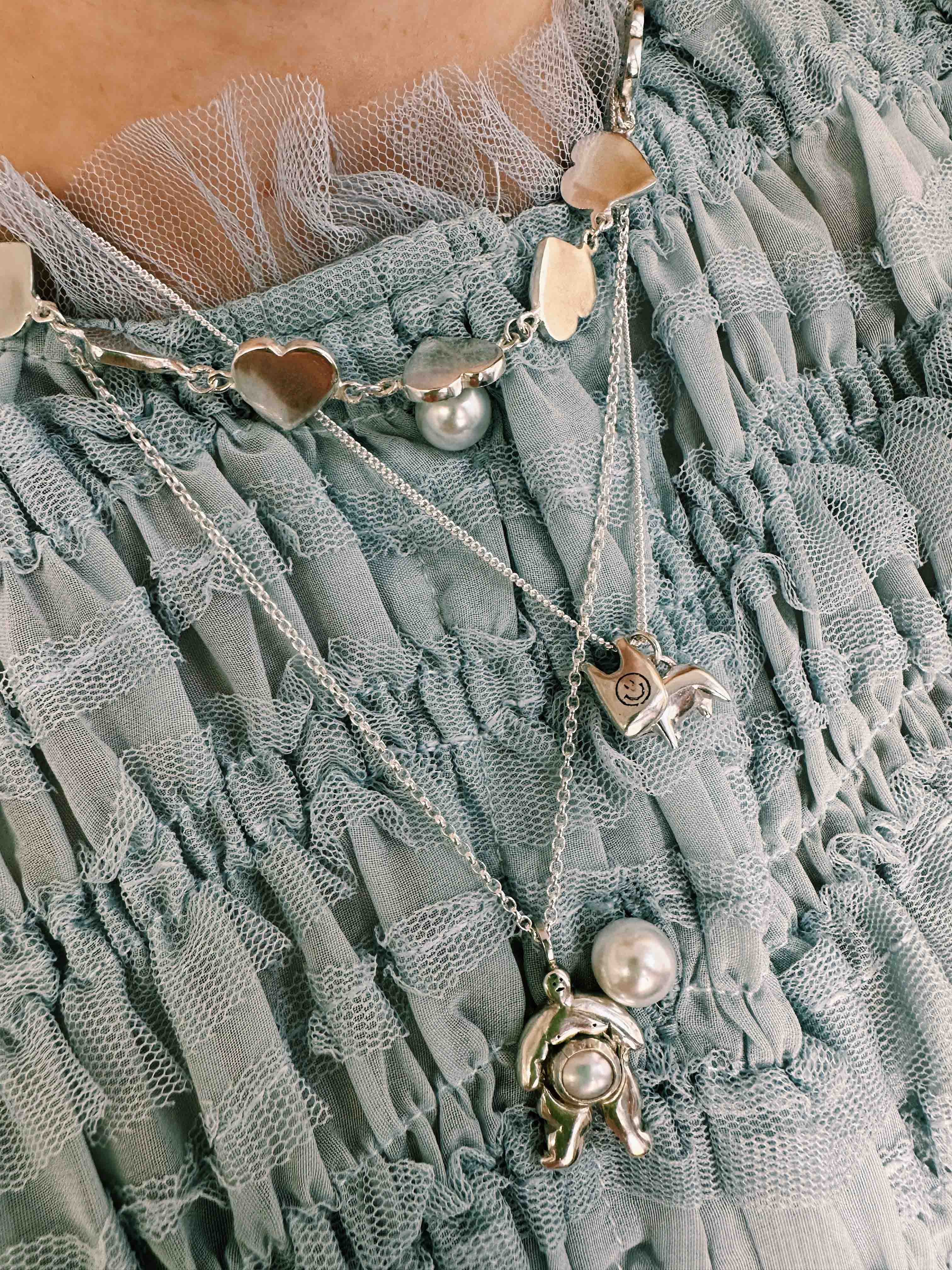 Model is wearing 16" Sad T-Bar necklace, 18" Bag for Life necklace and 20" letter M alphabet necklace.