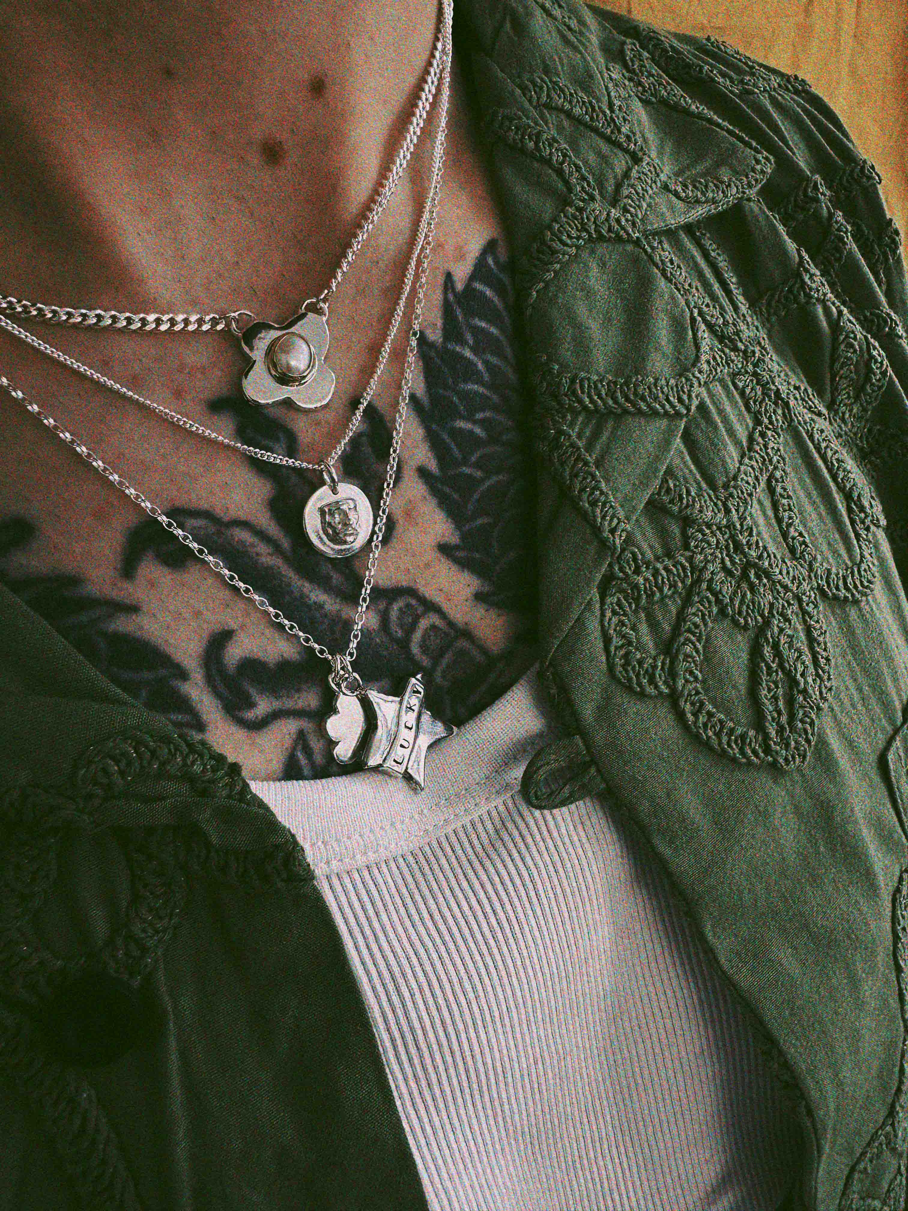 Vintage second-hand pearls set on a solid sterling silver pendant secured with a 9ct Fairmined gold bezel on a 2.75mm sterling silver diamond cut curb chain.
