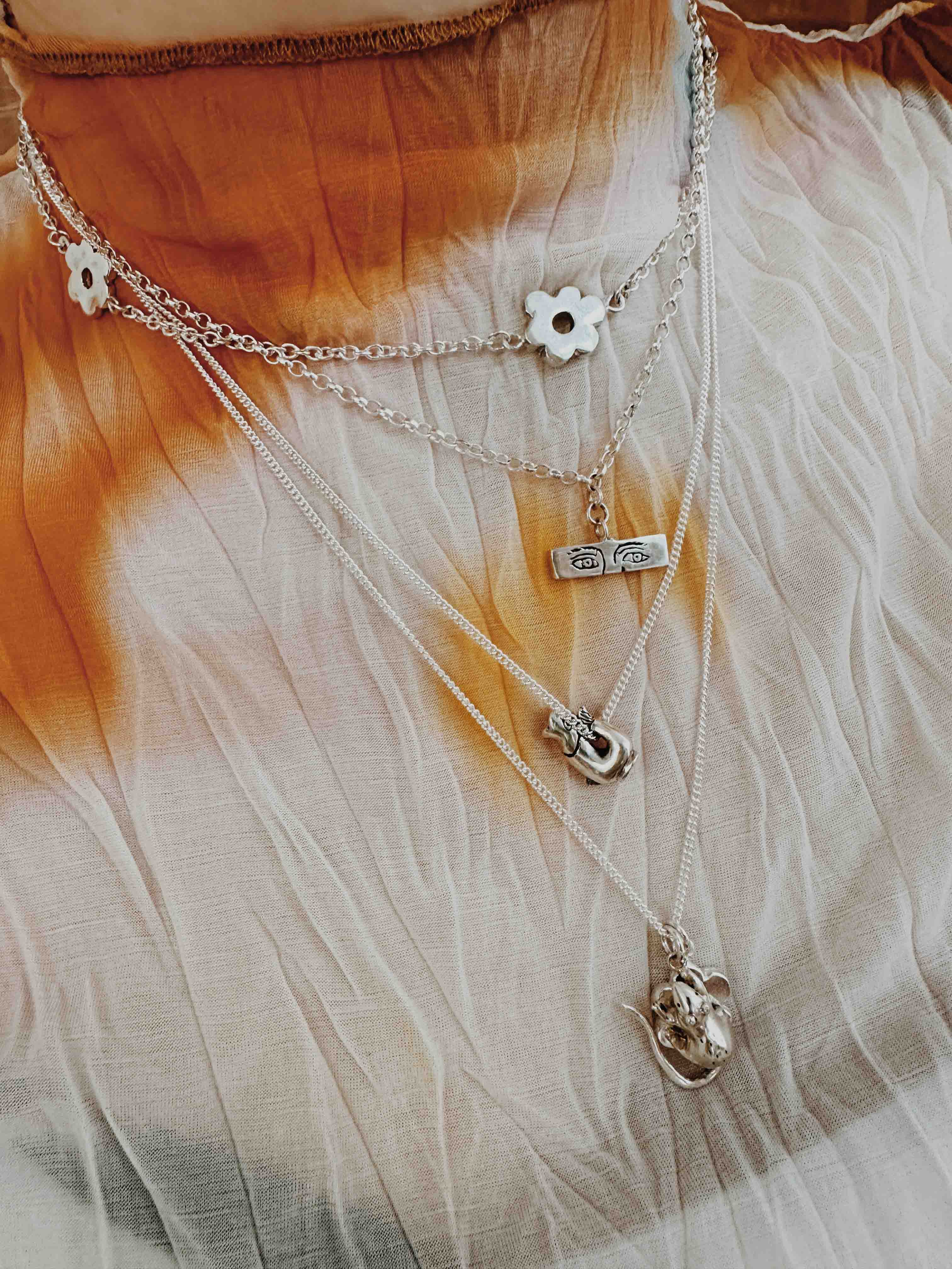 The flower necklace! Wonky flower charms built into a sterling silver belcher chain. The necklace comes with two options: three solid flowers or all three with a centre hole.