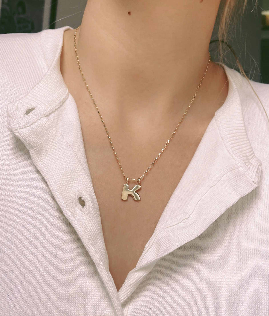 Hand-carved gold initials suspended on a gold belcher chain.